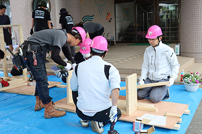 - 職員研修に合わせて、園庭で使用するテーブルやベンチ、遊具収納棚をDIY作業で作成しました。作成にあたり、様似建成会の皆様に電動工具の使い方や作業の留意点を教えていただいたことで、職員も安全に楽しく作業を進めることができました。